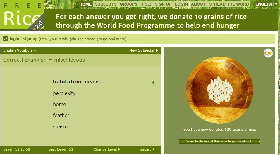 Freerice.com makes a game out of raising money for charity. Take quizzes in a variety of subject topics like Famous Quotations, different languages and more. There’s even a section of SAT prep to grow college-level skills. The site is completely free to the player, and all donation costs are covered by the ads hosted on the bottom of the page. All you have to do is flex your trivia skills, and you could feed a family in need. That’s what they call a win-win.