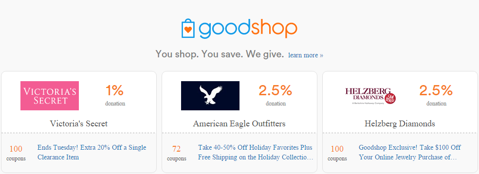 Goodshop connects you to major brands that are teaming up with major charities. When you shop on the site, partnered retailers will automatically donate a percentage to charity. The site also shares coupon codes that you can redeem for free shipping and discounts. Every time you search, they donate to charity! Now you can splurge and still give back.