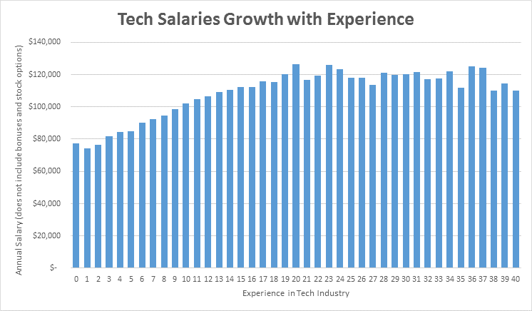 Another reason why salary growth diminishes for tech professionals after 15 years of experience or more is because it may be hard to keep up with new trends in technology and compete with new tech talent entering the workforce.