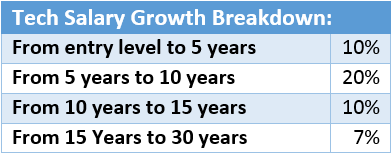 Based on the data we’ve found, below is a breakdown of salary growth after 5, 10, 15, and 30 years of work experience in the tech industry:
